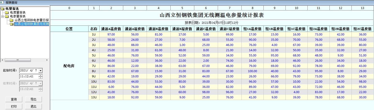 3)運行報表:查詢及打印各測溫點指定時間的溫度數據。