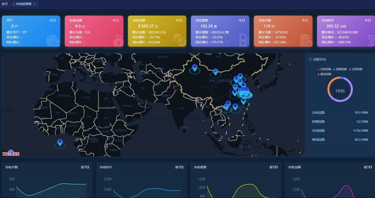 通過物聯網技術,對接入系統的充電樁站點和各個充電樁進行不間斷地數據采集和監控,同時對各類故障如充電機過溫保護、充電機輸入輸出過壓、欠壓、絕緣檢測故障等一系列故障進行預警。云平臺包含了充電收費和充電樁運營的所有功能,包括城市級大屏、交易管理、財務管理、變壓器監控、運營分析、基礎數據管理等功能。