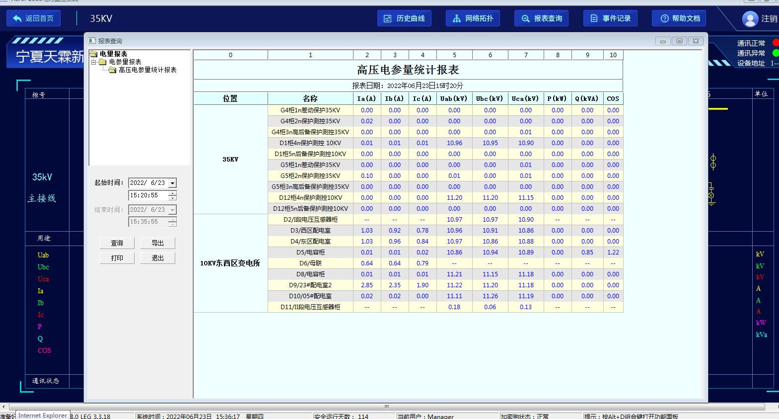 3)運行報表: 查詢各回路或設備指定時間的運行參數,報表中顯示電參量信息應包括:各相電流、三相電壓、總功率因數、總有功功率、總無功功率、正向有功電能等,報表格式有日報表、月報表、年報表等。