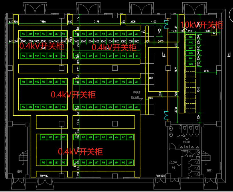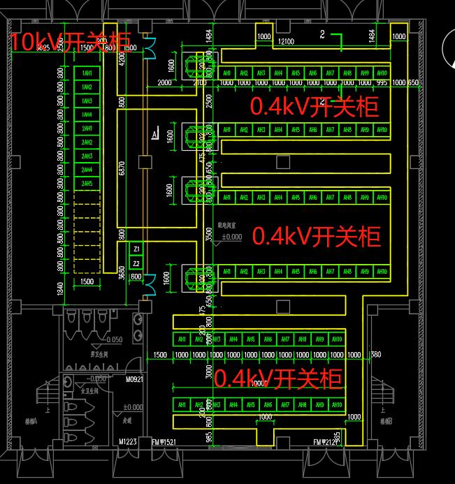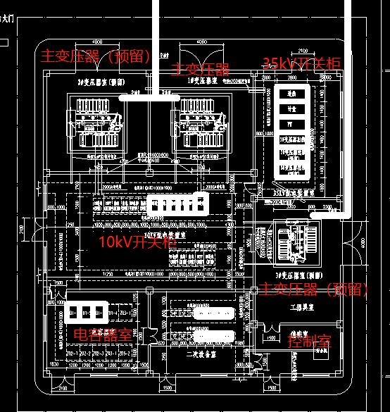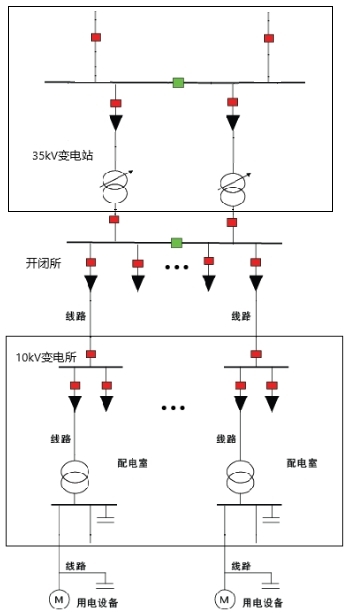 本工程共有一個35kV變電站和1個10kV開閉所,2個10kV變電所,35kV市電引入后經由35kV/10kV變壓器,降至10kV電引入開閉所,再由開閉所進行分配電能至各個分變電所,整個變電站的一次系統干線圖以及平面布局圖如下: