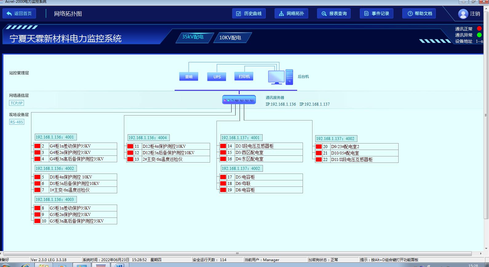 10)網絡拓撲圖:支持實時監視接入系統的各設備的通訊狀態,能夠完整的顯示整個系統網絡結構;可在線診斷設備通訊狀態,發生網絡異常時能自動在界面上顯示故障設備或元件及其故障部位。