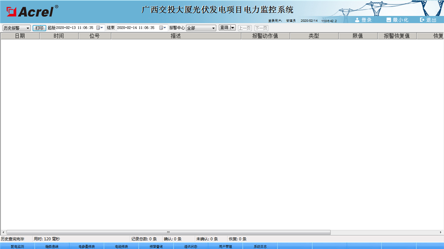 可針對光伏發電現場的各種事件進行記錄,如:通訊采集異常、開關變位、操作記錄等,時間記錄支持按類型查詢,并可對越限報警進行更改設置如下圖所示: