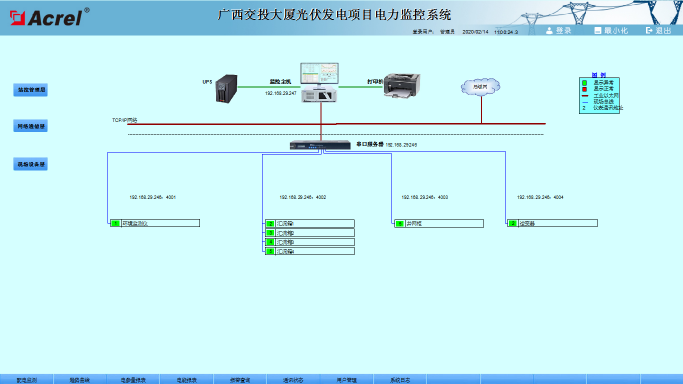 在光伏發電系統中,發電系統的安全性至關重要,本文介紹的Acrel-2000電力監控系統在廣西交投大廈光伏發電項目的應用,可以實現對發電回路的電參量的實時監控,不僅能顯示回路發電狀況,還具有網絡通訊功能,可以與串口服務器、計算機等組成電力監控系統。系統實現對采集數據的分析、處理,實時顯示光伏系統的運行狀態,對參數越限具有彈出報警對話框、語音提示,并生成各種電能報表、分析曲線、圖形等,便于電能的遠程抄表以及分析、研究,該系統運行安全、可靠、穩定,為項目解決用電問題提供了真實可靠的依據,取得了較好的企業效益。