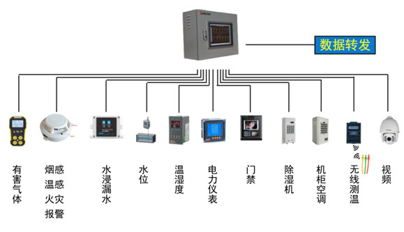 配電室綜合監控是整個電能管理系統中的一個重要環節,一般以低壓網中的配電室環境溫濕度、配電開關狀態、漏水/水浸、煙霧及配電室的防盜為監測對象,對配電房重要設備運行狀態的多種參數和狀態進行本地聯動控制、遠程集中監控、手機短信報警。配電室的全信息采集和監控對配電室自動化運行管理、檢修維護、防災預警、安全防護、電力需求管理等應用具有重大意義。