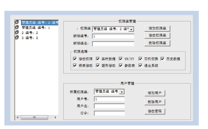 為保障系統(tǒng)安全穩(wěn)定運行,設置了用戶權(quán)限管理功能。通過用戶權(quán)限管理能夠防止未經(jīng)授權(quán)的操作(如遙控的操作,數(shù)據(jù)庫修改等)??梢远x不同級別用戶的登錄名、密碼及操作權(quán)限,為系統(tǒng)運行維護、管理提供可靠的安全保障。