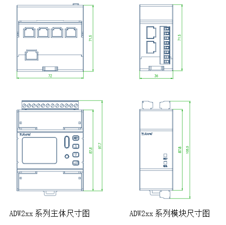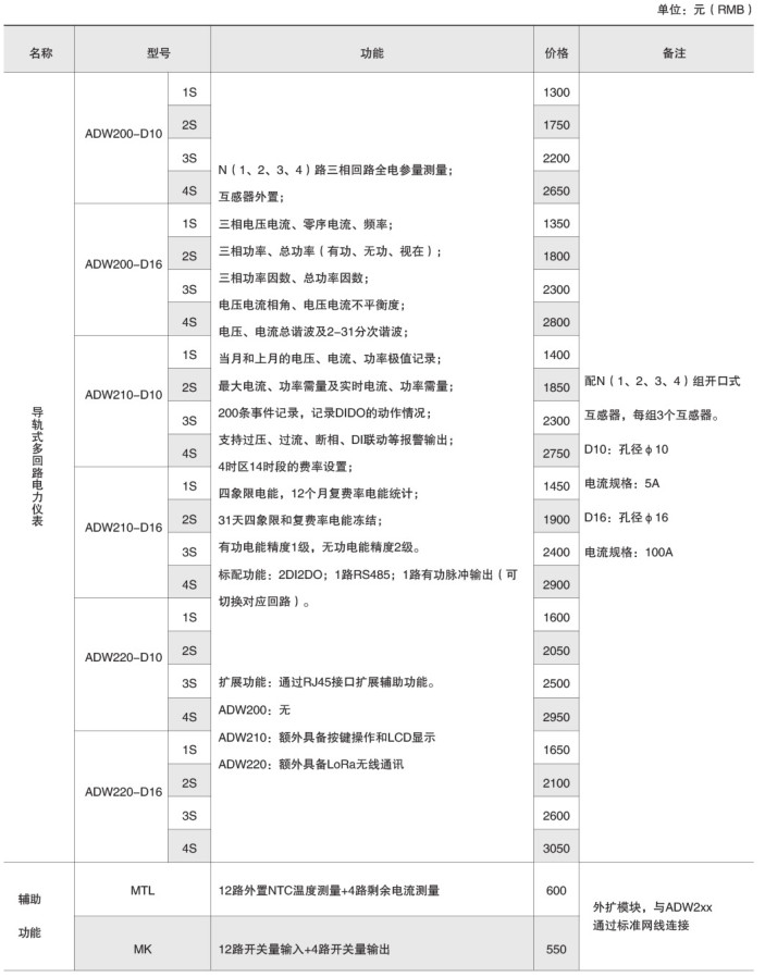 ADW2xx系列導軌式多回路電力儀表主要用于低壓三相回路全電參量測量,同時可選擇四個回路的電流輸入。可直接或間接測量電壓、電流、功率、功率因數、相角、不平衡度、諧波等參數。 還可通過其RJ45接口擴展輔助功能,實現DI、DO、測溫、剩余電流測量,以及2G、4G、LoRa、LoRaWan、NB-Lot無線通信功能。